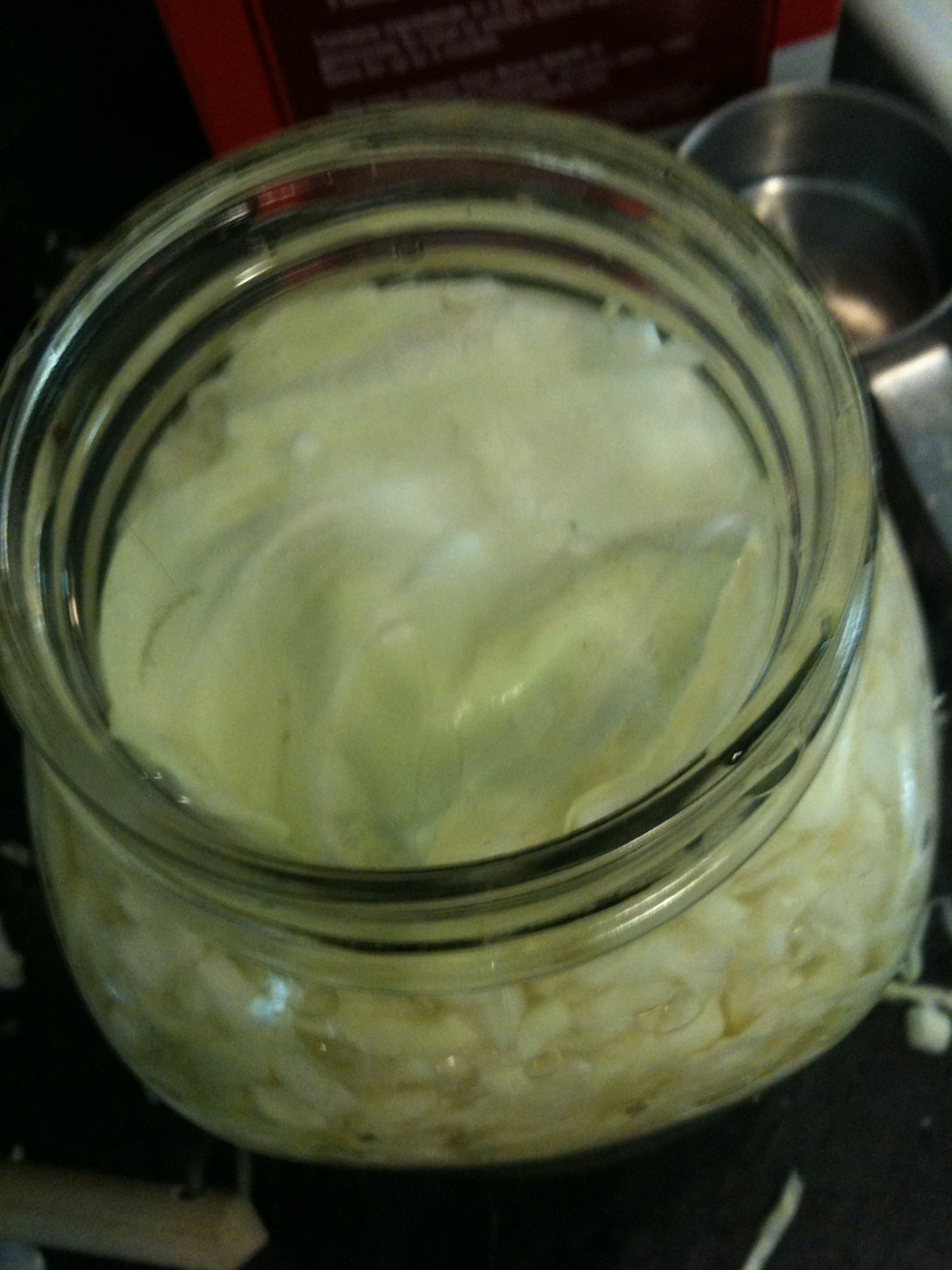 Really push down hard; pretend you’re finally getting that chance you’ve been praying for to grind a fist into the face of your most irritating coworker.  Toss in a few more handfuls of cabbage and repeat until you’ve got it packed so tight that it’s right up to the neck of the collar and hardly moves when you push down on it.  A surprising amount of cabbage will fit in each jar.  In a little measuring cup, dissolve 1 Tbsp of sea salt or kosher salt in 2/3 cup of bottled water.  Don’t use table salt, it tends to be iodized and the bugs don’t like that.  Likewise, use bottled or distilled water if you can because they can get cranky about the chlorine in tap water too.  Carefully pour this brine into your packed jar until it hits the bottom of the collar on the jar.